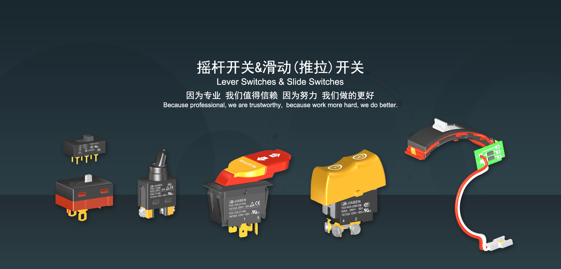 浙江佳奔電子有限公司始建于1986年,坐落于浙江省樂(lè)清市虹橋鎮(zhèn)東電子信息產(chǎn)業(yè)園內(nèi),現(xiàn)有職工700多人,資產(chǎn)總額超3億元。公司主要經(jīng)營(yíng)“JIABEN”牌微動(dòng)開(kāi)關(guān)、蹺板開(kāi)關(guān)、按鈕開(kāi)關(guān)、扳機(jī)開(kāi)關(guān)、調(diào)速開(kāi)關(guān)和電位器開(kāi)關(guān)等各類交、直流器具開(kāi)關(guān)和各類交、直流線路板模塊等產(chǎn)品,主要應(yīng)用于交、直流電動(dòng)工具、電動(dòng)園林工具、清潔器具、家用電器和小型機(jī)床等行業(yè),是集產(chǎn)品設(shè)計(jì)、研發(fā)、制造、銷售和服務(wù)于一體的國(guó)家高新技術(shù)企業(yè)。JIABEN was founded in 1986, located in East Electronic Information Industry Park, Hongqiao Town, Yueqing City, Zhejiang Proviance, existing staff more than 700 peoples, more than 300 million RMB worth of assets. Company is mainly engaged in "JIABEN" brand Micro Switch, Rocker Switch, Push-button Switch, Trigger Switch, Speed Regulating Switch, Potentiometer Switch and other kinds of appliance switch and all kinds of AC or DC circuit board module, such as more than 100 series, 8000 kinds of models of products, mainly used in AC or DC Power-tools, Power Gardening Tools, Cleaning Appliances, Household Appliances and Small Machine Tool and other industries, is the collection product design, research and development, manufacturing, sales and service in one of the national high and new technology enterprise.